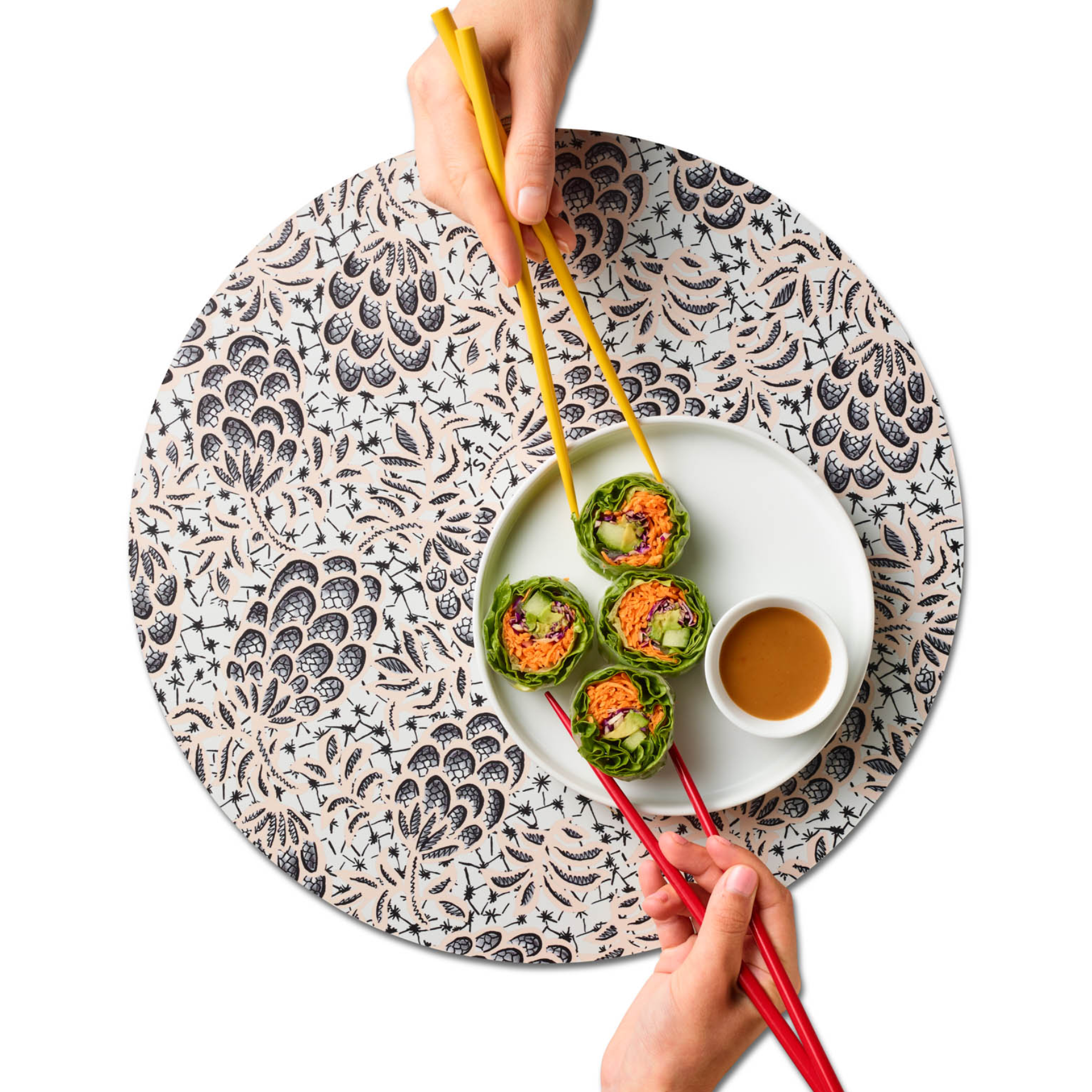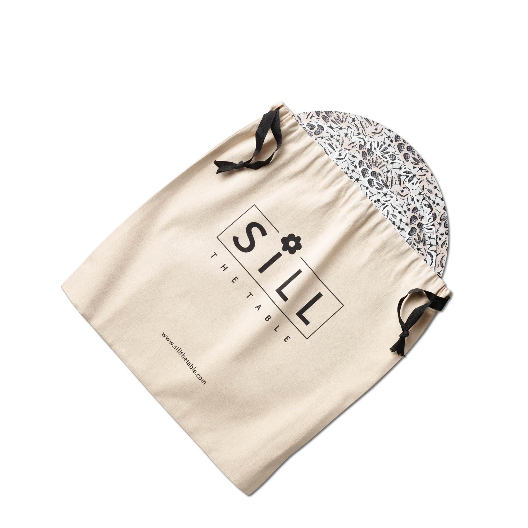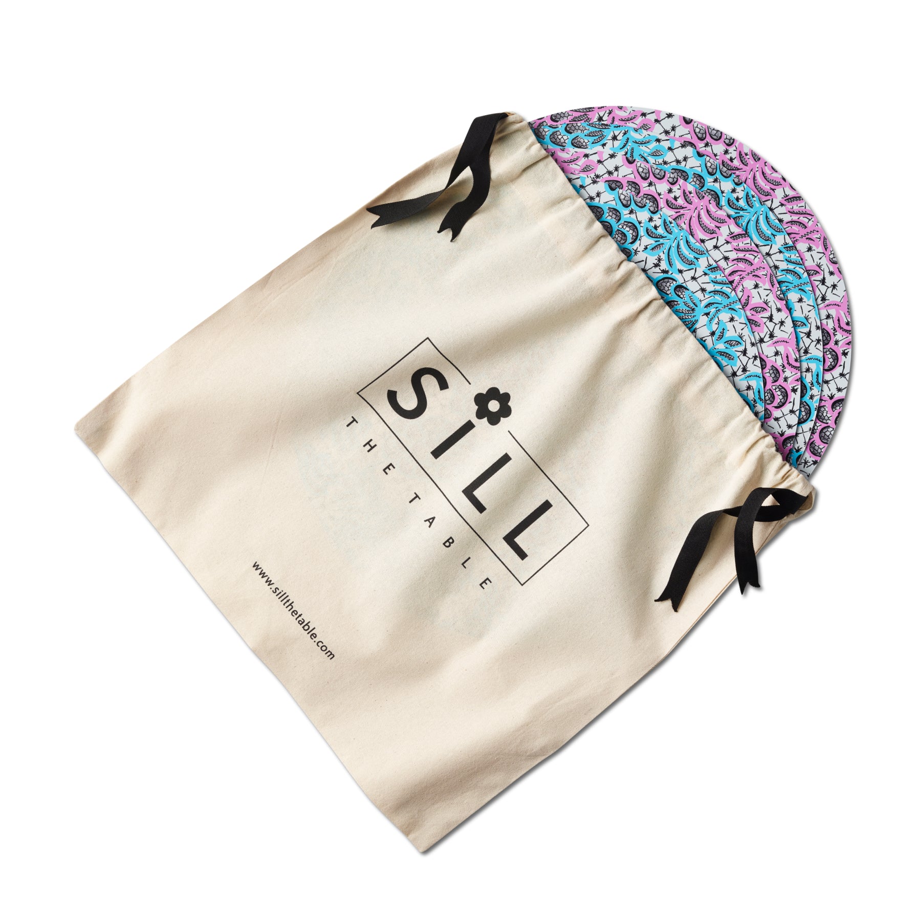 SiLL’s blackberry placemat features lucious, curvilinear vines of fruit and blackberries that are bursting in color and “ripe” for any mealtime. The design is carried out on both sides of the placemat but in different colorways. One set includes four placemats and a drawstring storage bag made of organic, recycled cotton.