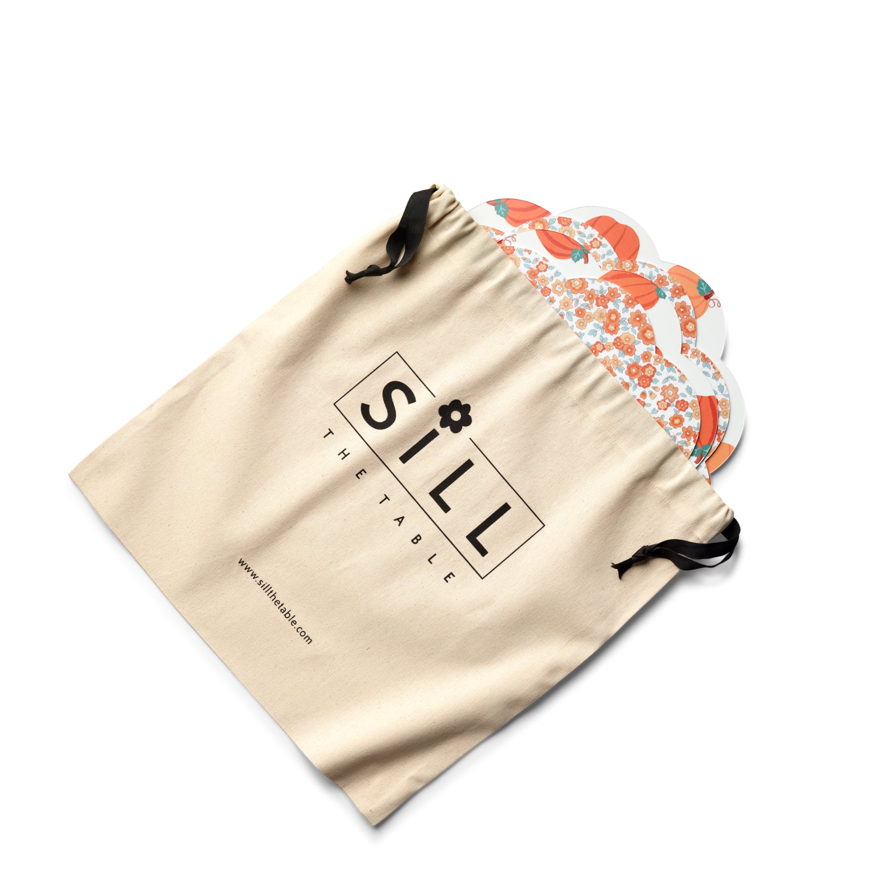 SiLL’s fall placemat combines an autumnal flower repeat on one side with a playful patch of pumpkins on the other. This placemat will keep you entertained and entertaining from Halloween through Thanksgiving. One set includes four placemats and a drawstring storage bag made of organic, recycled cotton.