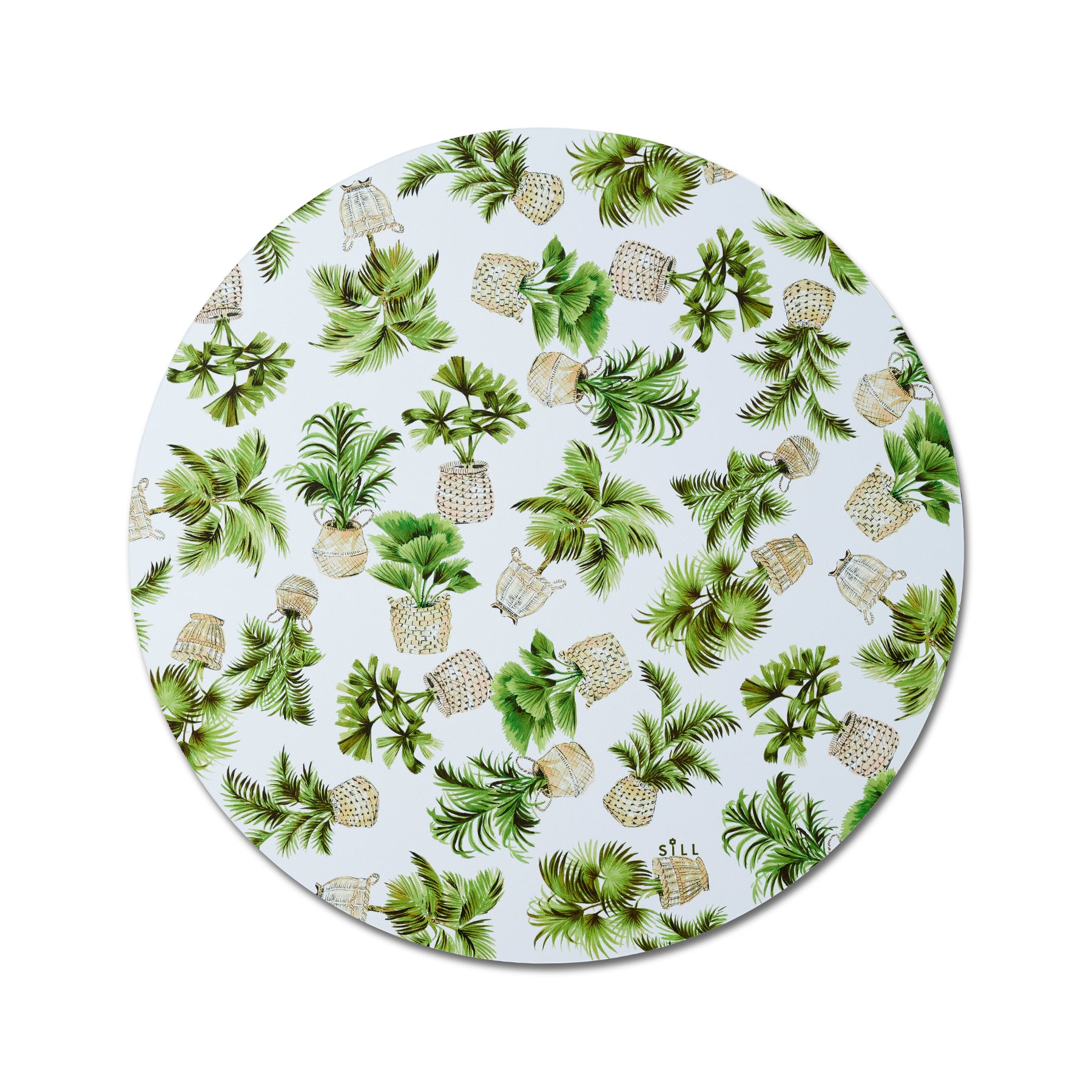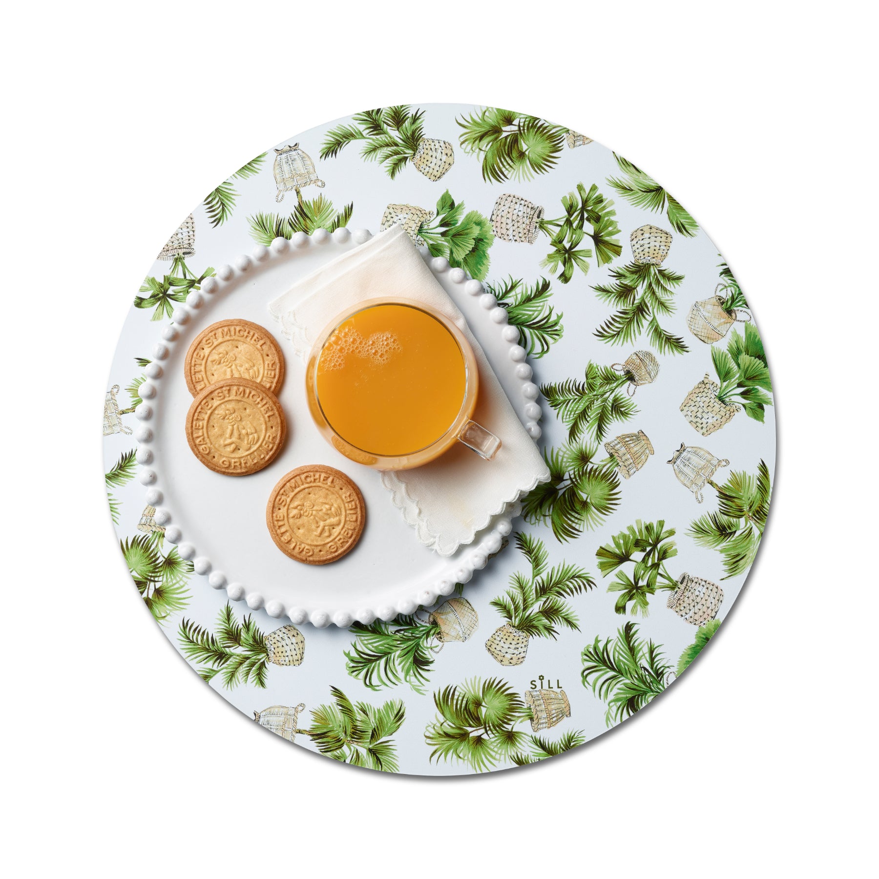SiLL’s spring placemat combines palm trees in woven baskets on one side with a fern motif on the other. Both designs feature rich verdant green hues that hint at warmer weather and al fresco dining. One set includes four placemats and a drawstring storage bag made of organic, recycled cotton.