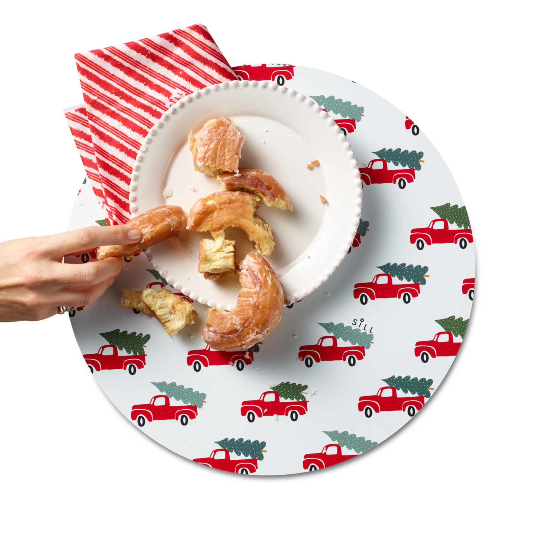 Peppermints, red trucks and trees, oh my! Our holiday placemat features delicious red-and white candy stripes on one side and a classic red truck hauling a Christmas tree on the other. Intended for use well beyond the holidays, this style would provide a chic splash of red on any table-setting throughout the year, but especially on Valentine’s Day; it also pairs perfectly with these napkins. One set includes four placemats and a drawstring storage bag made of organic, recycled cotton.